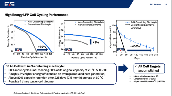 同时,新能源领域对高性能电池的需求不断攀升,旭化成乙腈电解液技术因能显著优化电池性能受企业关注。EAS通过合作将该技术用于磷酸铁锂电池,大幅降低电池内阻,连续放电功率密度达2550W/kg,较传统电解液电池提升超65%;循环寿命增加60%,60℃存储225天容量保持率超80%。对此类电池,目前EAS已有量产计划,将覆盖12V/24V/48V电压等级,适配汽车启动、工业设备等多场景。